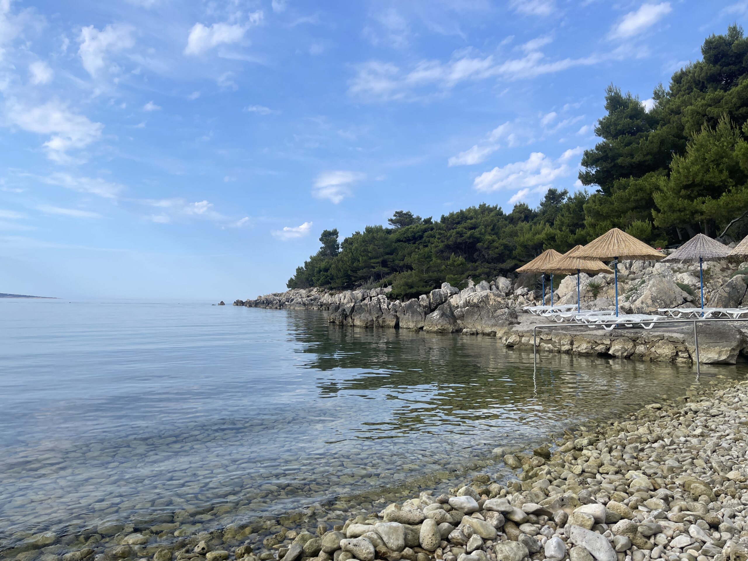 Families will find it especially welcoming – there’s a gradual entry section perfect for children with nearby waterslide, and the Adriatic’s gentle, crystal-clear waters make it safe for everyone.